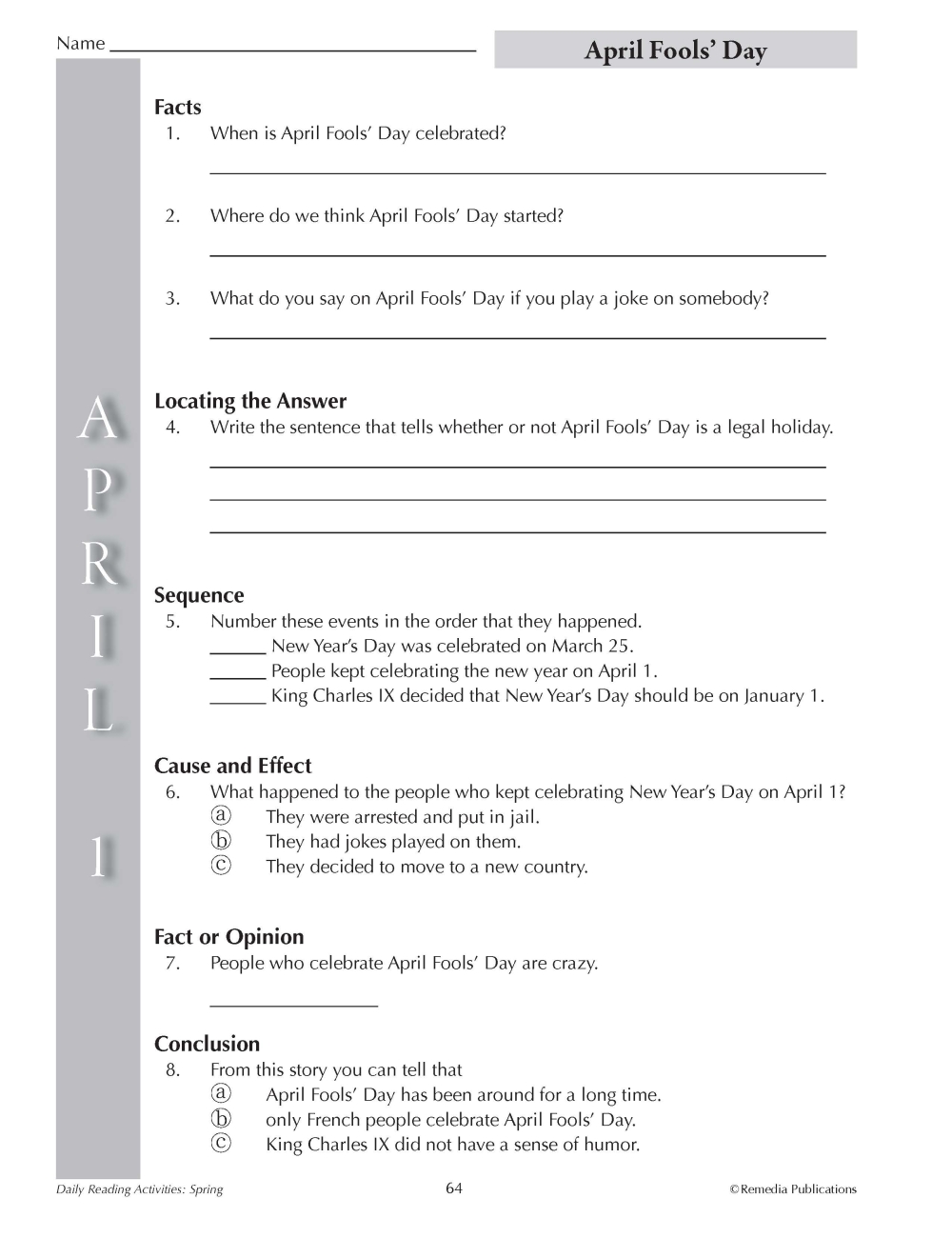 APRIL Daily Reading Activities: Main Idea, Fact/Opinion, Inference | Activities