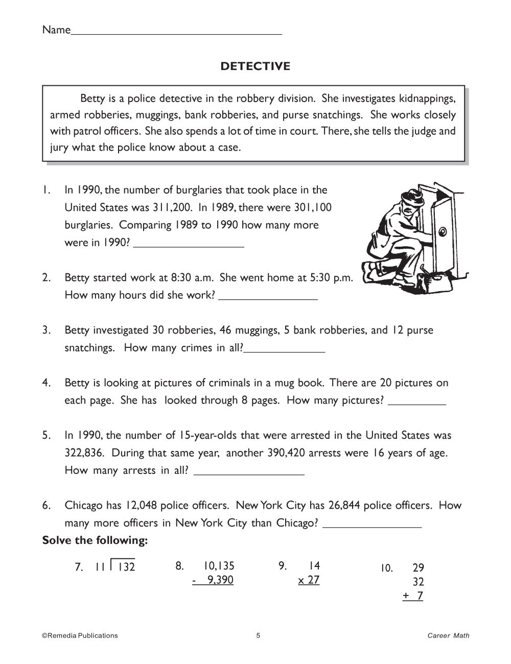 Students learn about 28 different jobs ranging from air traffic controller to zookeeper! Realistic scenarios challenge students to solve addition, subtraction, multiplication, and division word problems pertaining to each career. Simple decimal and money computations are also required in some of the exercises. These realistic lessons are the perfect way to build students’ math skills and help them gain a true appreciation for math in everyday living. A real, practical application of math!