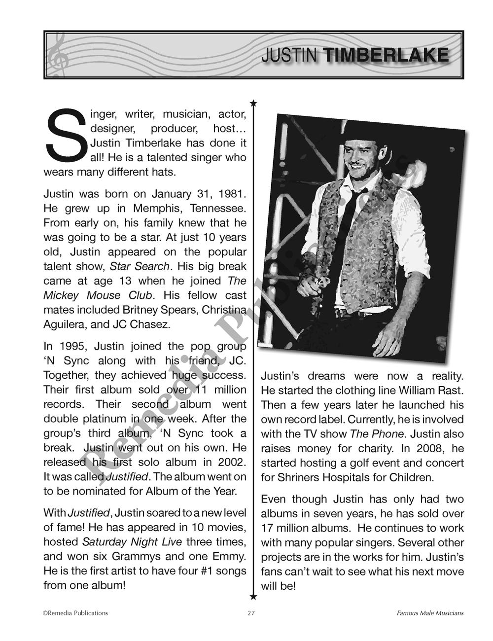Watch reluctant readers become eager readers with this star-studded series! Each high-interest book contains 14 mini-biographies of today's hottest stars along with a variety of fun activities to test comprehension. As an added bonus, an extended research activity is also included with each captivating story.