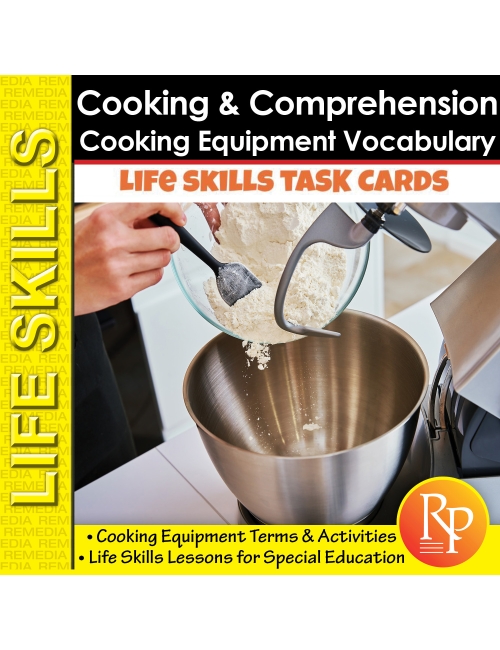 Help students on the road to independence with these interactive cooking equipment vocabulary lessons! Using realistic photos and easy-to-read definitions, students are introduced to the real-life world of cooking methods, tools, and appliances. From blenders to toaster ovens and colanders to woks, key vocabulary is introduced then reinforced with easy-to-read comprehension and cloze reading activities. These easy-to-use task cards are great for daily instruction, performance monitoring, transition programs, assessment, and review.
