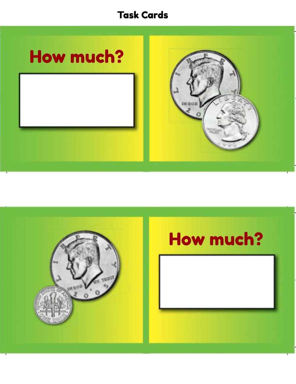 Help students learn to identify coins and count money up to $1.00 with these visual, hands-on task cards. Each task card challenges students to add a group of coins, then show what they know. Realistic coin images include pennies, nickels, dimes, quarters, and 50 cent pieces. A great way to focus on math standards in a fun and engaging way.
