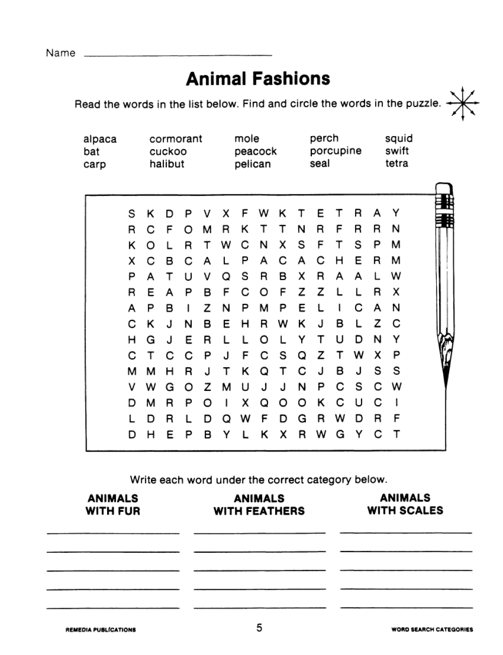 Students are challenged to find and circle the given words in the word search, then categorize the words under three headings.