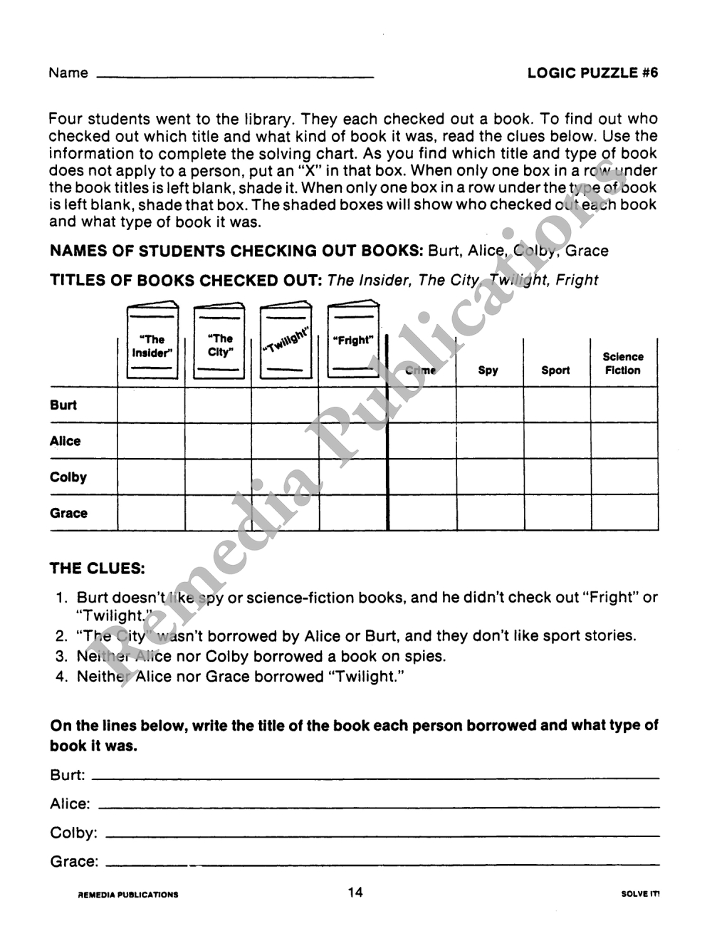 S-T-R-E-T-C-H logical thinking skills! Solving oodles of picture problems and word logic puzzles in this book will keep students’ minds active and promote logical thinking. Students must learn to organize the clues presented so they can reach the logical solutions. In all, there are 25 exercises that progressively increase in difficulty.