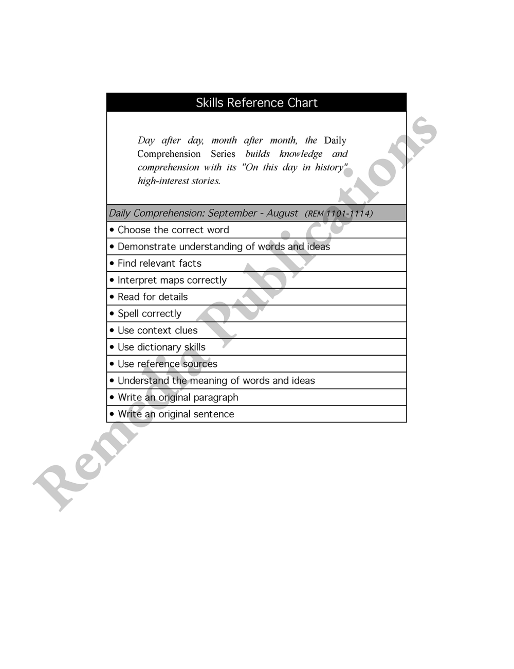 A lesson a day in October! This reproducible activity book offers a different nonfiction story for each day of the month, which was chosen because of its particular significance on that date. These high-interest low-vocabulary stories are followed by high-interest activities designed to improve overall reading comprehension while focusing on specific skills. Best of all, you will never run out of usable activities again!