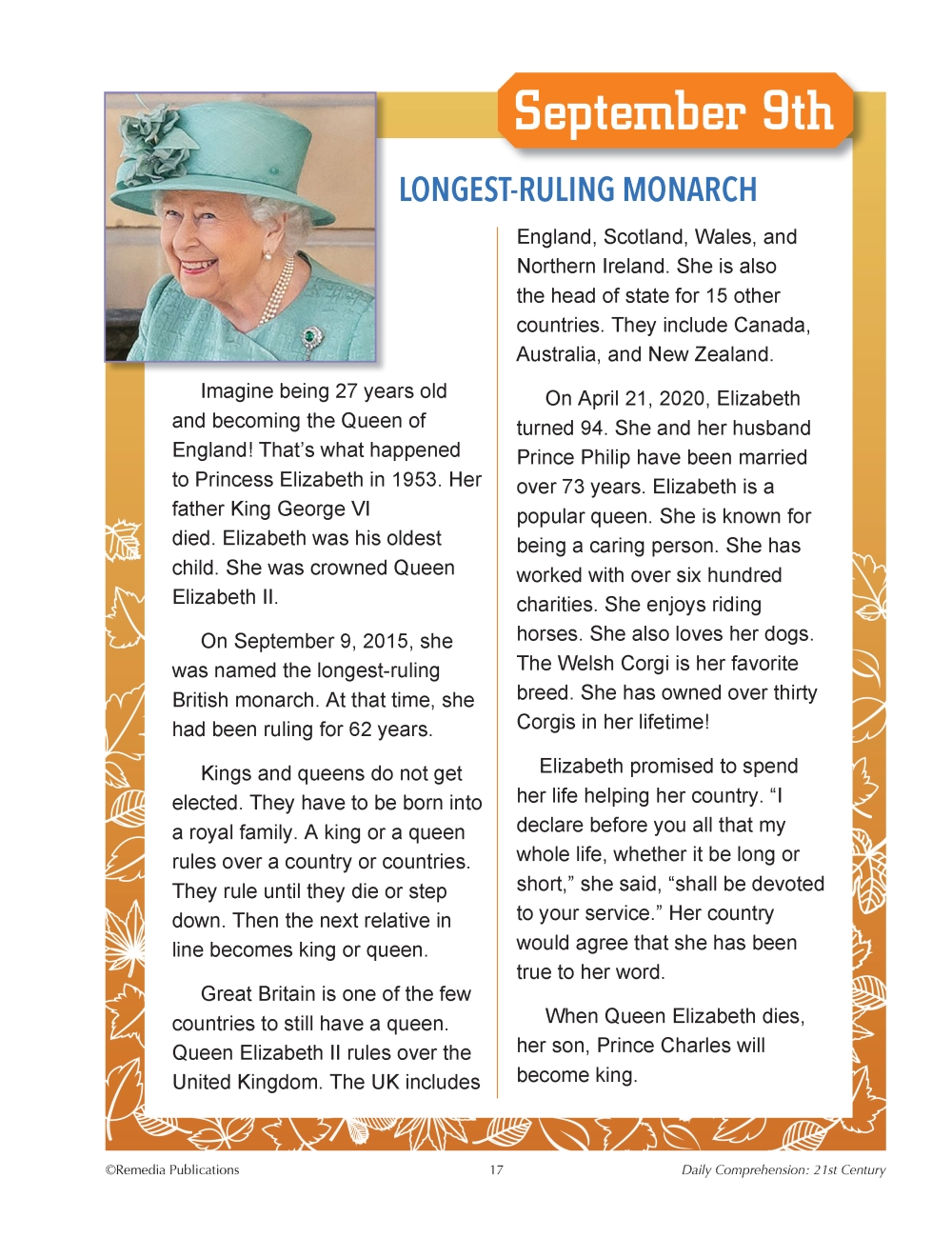 This 21st Century Daily Comprehension resource is an updated version of our popular Daily Comprehension series. A high-interest, nonfiction story has been chosen for each day of the month. The stories are a combination of historical, scientific, record-breaking, sports, and pop culture events that happened on that particular day. All of the stories are about events that occurred during the 21st Century.