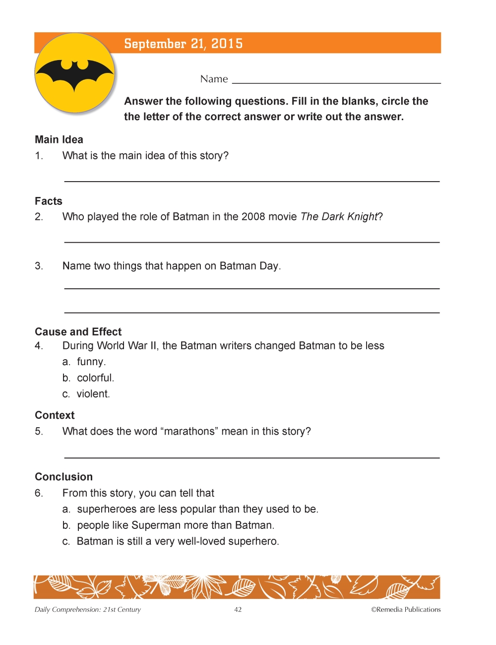 Stories feature recent events from the 21st century and are followed by skill-specific comprehension activities to sharpen essential reading skills. Questions are clearly labeled with the standard/skill that it meets.