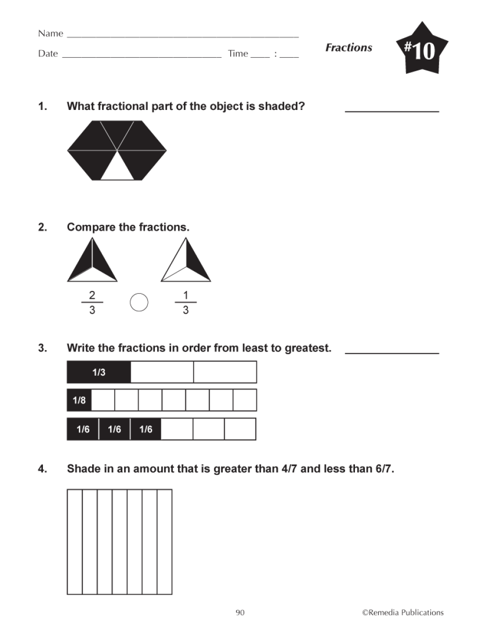 The 10 activities in this unit offer students practice with finding the fractional parts of an object, comparing fractions, shading objects to represent a fraction, and more. Each activity includes four questions. These easy-to-implement activities cover math skills introduced in most 3rd grade texts and reviewed in 4th grade texts, or are also an excellent resource for older, below-grade-level students who struggle with this math concept. Answer key included.