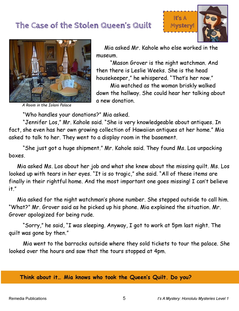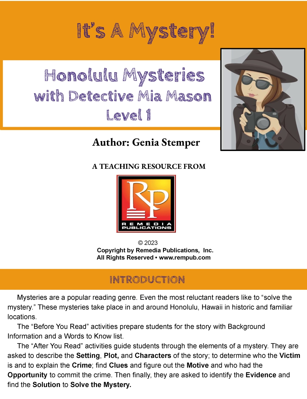 Follow the clues around Honolulu with Detective Mia Mason as she uncovers the truth in each short, high-interest mystery - guaranteed to capture the attention of even the most reluctant readers! Students will LOVE following clues, discovering facts, gathering evidence, making inferences and solving these intriguing mysteries!