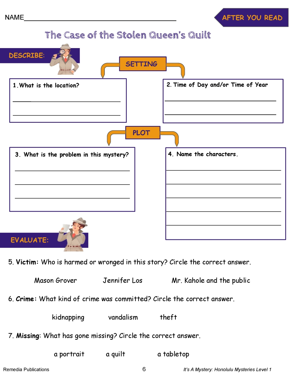 Step-by-step activities take students through the process of solving a mystery. Students start by describing the Setting. Then move on to all the elements of the Plot: identifying the Problem; naming the Characters; identifying the Victim and the Crime; discovering Clues; identifying Motive and Opportunity; and finally discovering the Evidence that leads to the Solution.