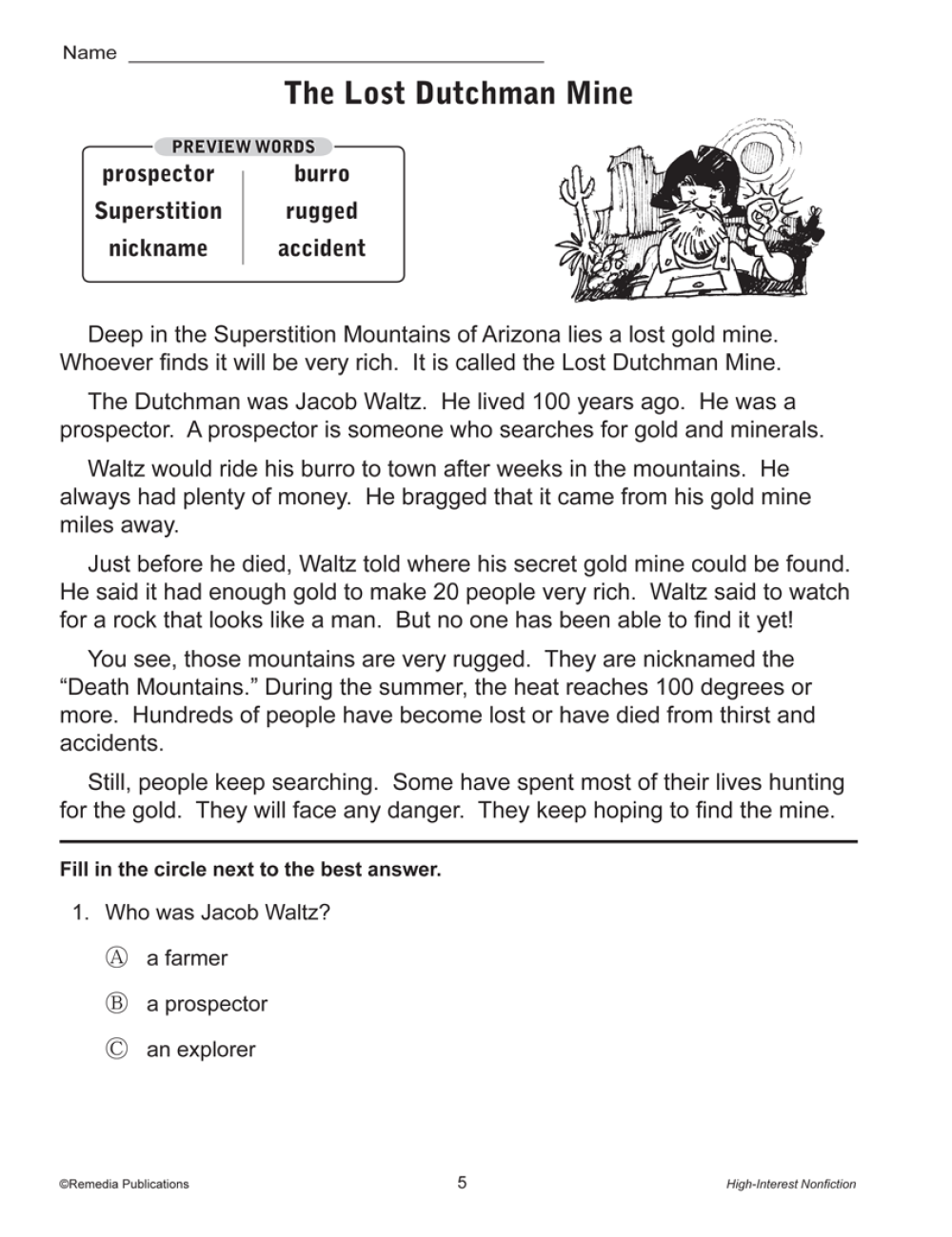 Capture your students’ attention and improve their reading comprehension skills with high-interest history and science topics! This book features 49 nonfiction stories based on themes ranging from pyramids and the D-Day Invasion to dolphins and wasps. Following each story are three skill pages featuring literal and interpretive comprehension questions based on Bloom’s Taxonomy, sentence writing practice, and a research/ writing activity. A chart of skills and answer key included. A wonderful supplement to any reading, history, or science program! 208 pages.