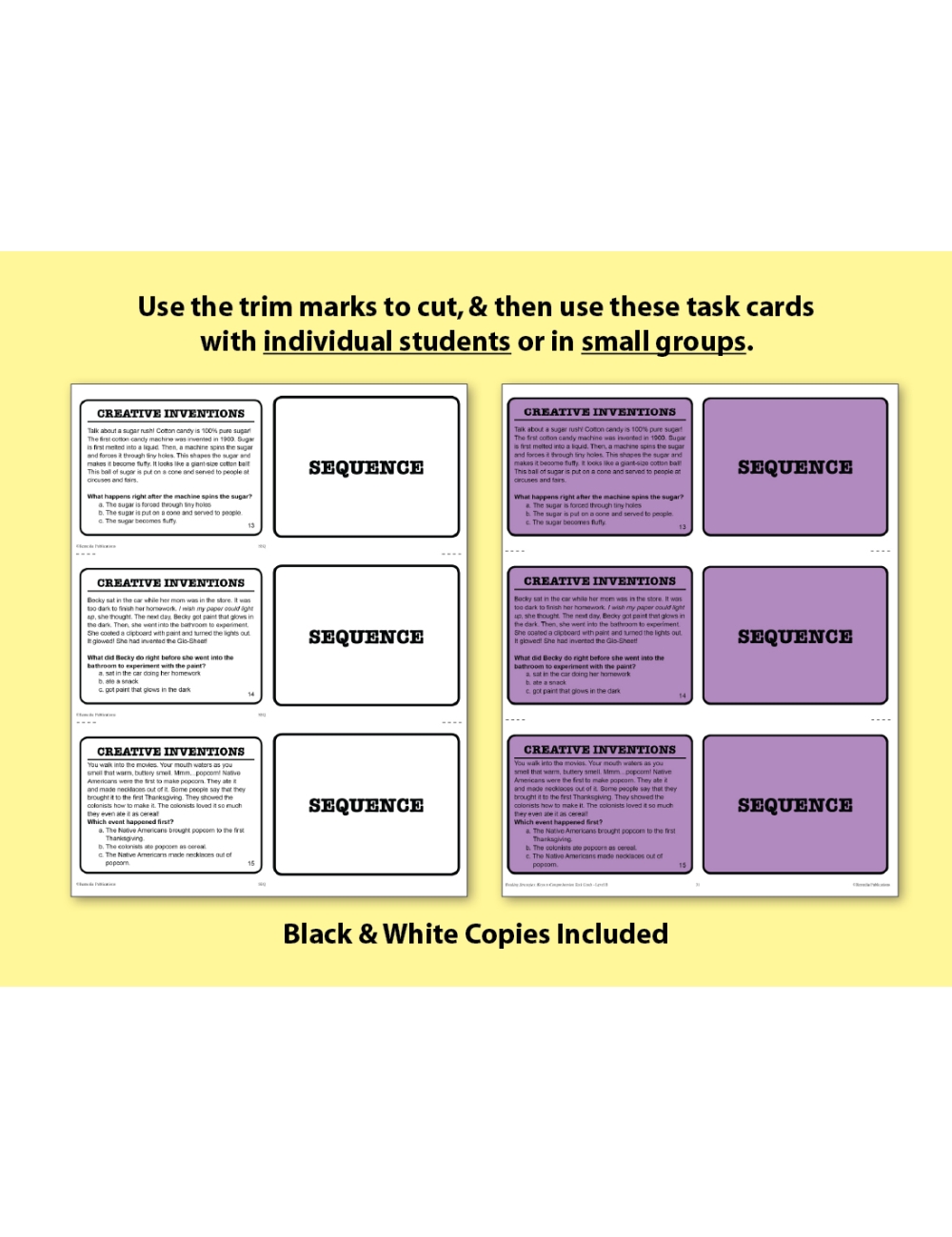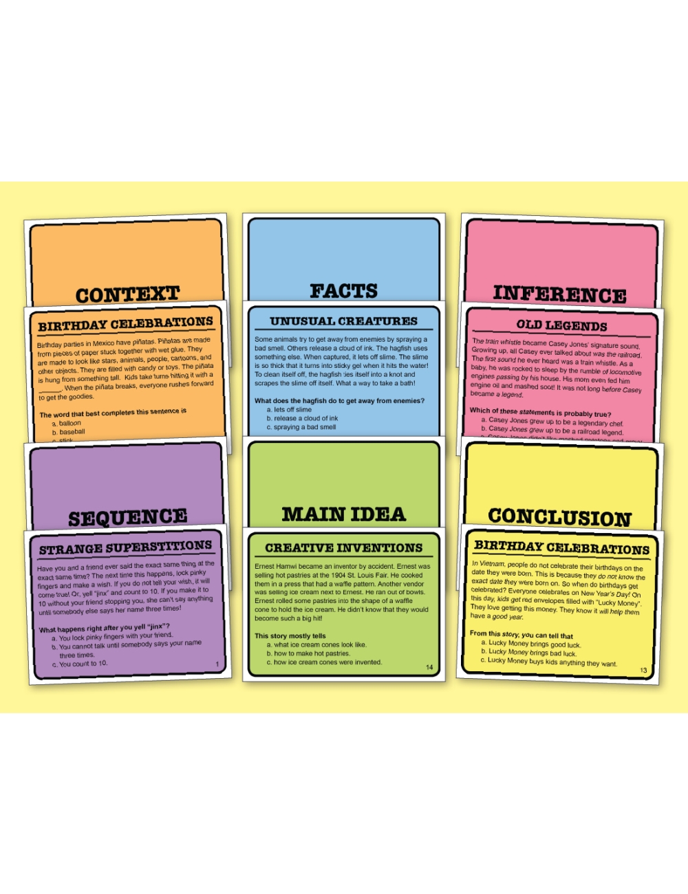 Each of the 90 task cards features a short story with text-dependent questions. There are 15 stories per skill. Each card asks a specific comprehension question—main idea, conclusion, sequence, inference, context, and facts—so that you can focus on one skill at a time!