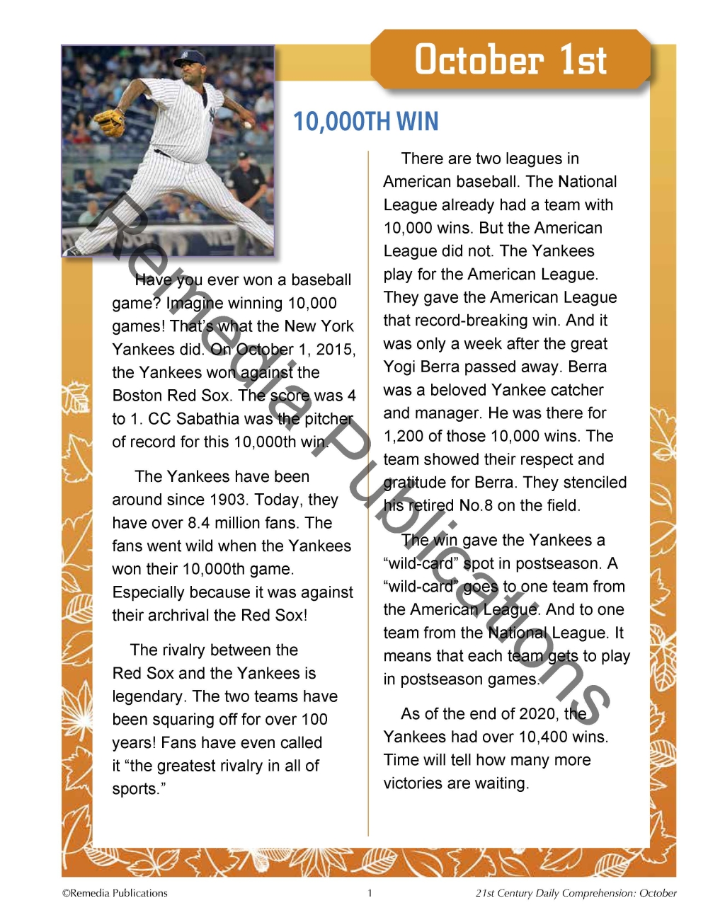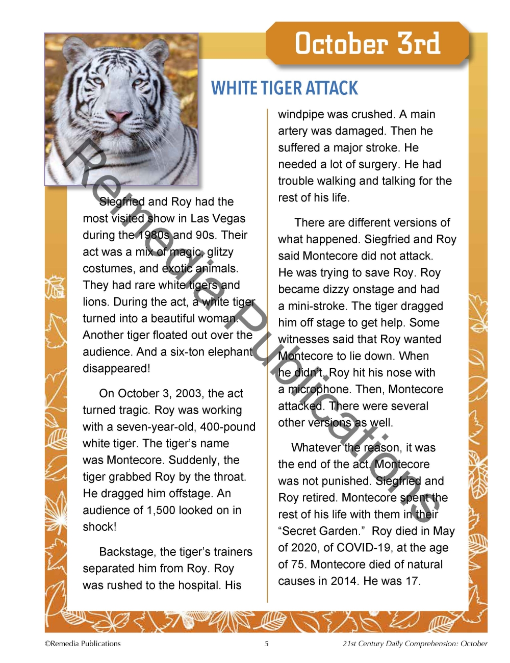 This 21st Century Daily Comprehension resource is an updated version of our popular Daily Comprehension series. A high-interest, nonfiction story has been chosen for each day of the month. The stories are a combination of historical, scientific, record-breaking, sports, and pop culture events that happened on that particular day. All of the stories are about events that occurred during the 21st Century.