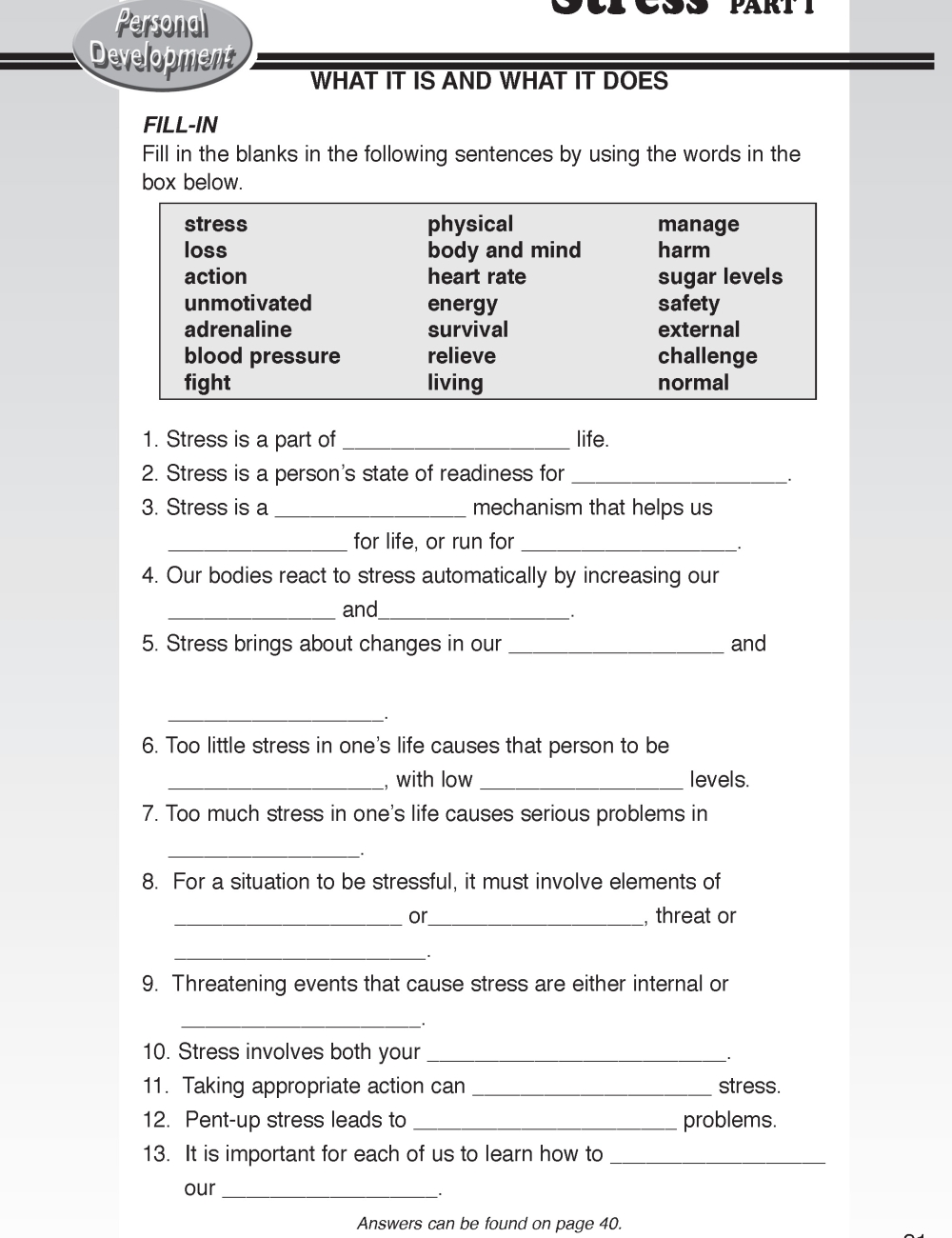 A variety of exercises follow the reading passages and guide students along their path to self discovery, while also helping them learn to make better choices in difficult situations. A variety of exercises are included such as true or false, matching, fill-in-the-blanks, multiple choice, sentence completion, crossword puzzles and subjective opinion.