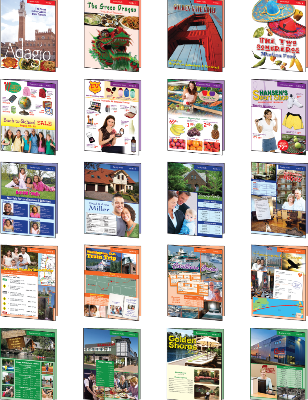 This real-life program features sturdy, glossy folders that are divided into 5 everyday math categories. Each category includes 4 unique folders. With the help of realistic information and photos, each folder tells a math “story.” Facts from the folders are used to complete comprehension questions that familiarize students with the folders and word problems that progress in difficulty throughout each category. The skills covered are clearly labeled on each activity page.