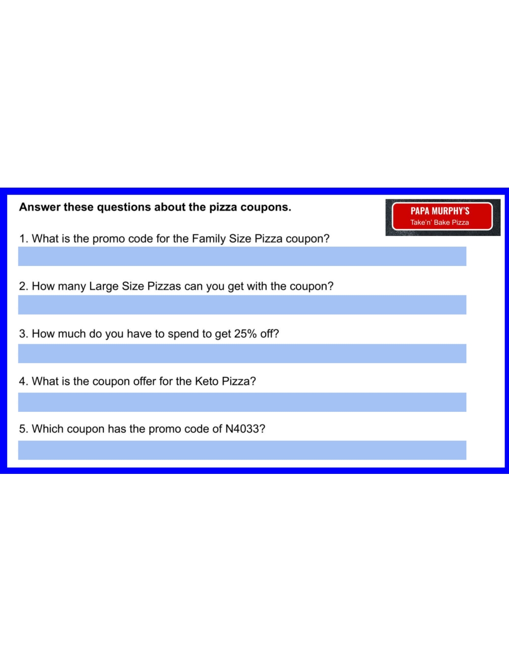 Level 1 questions refer students back to the coupon content to find the basic information they need to answer the questions. Comprehension skills include locating information and finding facts.