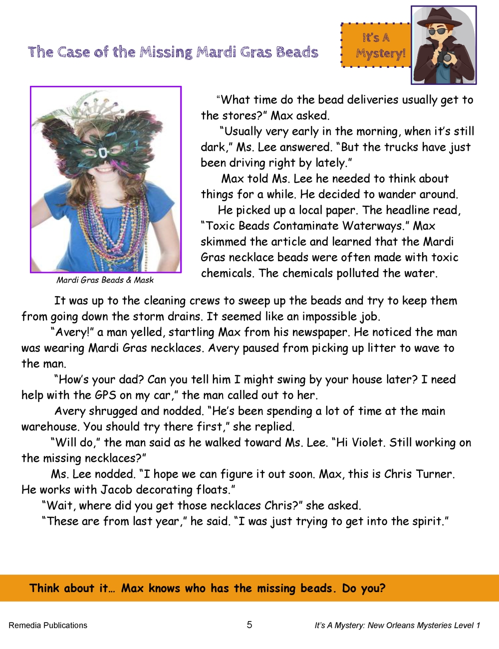 Follow the clues around New Orleans with Detective Max Malone as he uncovers the truth in each short, high-interest mystery - guaranteed to capture the attention of even the most reluctant readers! Students will LOVE following clues, discovering facts, gathering evidence, making inferences and solving these intriguing mysteries!