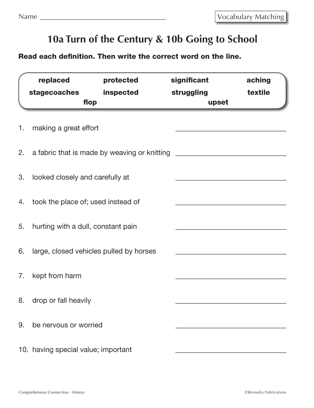 Vocabulary activities include: vocabulary matching, word search, and context.