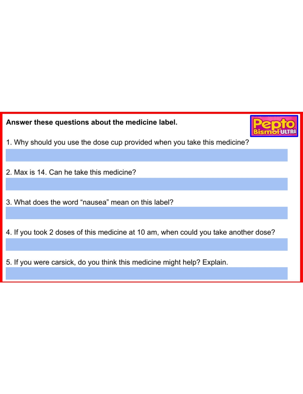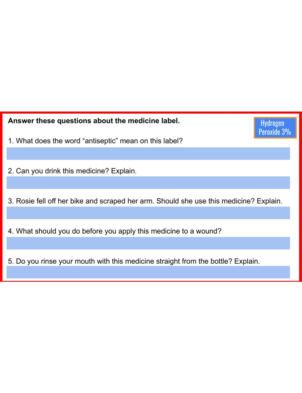 The questions refer students back to the medicine labels to find critical information about what each medicine is used for, who should be taking the medicine, how much medicine should be taken, and how often. Rather than only focusing on literal comprehension, these questions challenge students to read, interpret, and then apply the information found on each medicine label. Skills include: making inferences, drawing conclusions, using context clues to understand unfamiliar vocabulary, analyzing and applying information, figuring amounts of time, and more.
