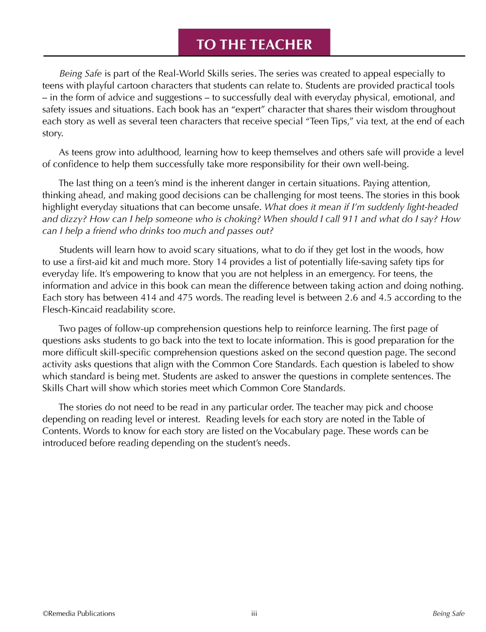 Is last week’s pasta safe to eat? How do I help someone who is choking?Living a safe life is more than just knowing first aid ... but the last thing on a teen’s mind is the inherent danger in certain situations. Paying attention, thinking ahead, and making good decisions can be challenging for most teens. These relevant and engaging lessons highlight everyday safety situations in a non-threatening and easy-reading style. What does it mean if I’m light-headed while hiking? Is it heatstroke? What should I do in case of a fire? How can I help a friend who drinks too much and passes out… Should I call 911? What should I say? These relevant lessons teach students how to keep themselves and others safe and take more responsibility for their own well-being. It’s empowering to know that you’re not helpless and are prepared for an emergency. For teens, the information and friendly advice found in this book can mean the difference between them taking action or doing nothing at all.