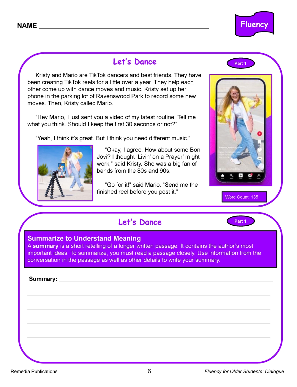 One of the ways that automaticity can be measured is by WCPM. Each story passage has a word count and progress can be tracked using the included Fluency Tracker chart for automaticity. Prosody is supported by an optional summarizing activity to help reinforce comprehension of each reading passage. Progress in prosody can be tracked using the included Fluency Tracker chart for prosody.