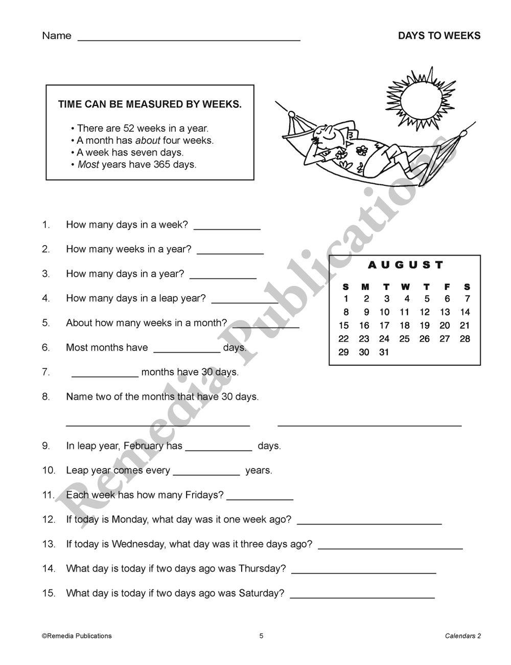 Knowing how to measure time in terms of days, weeks, months and years is an important life skill. Calendars, part of Remedia's Publications' Time Concepts Series, provides abundant practice in this skill.