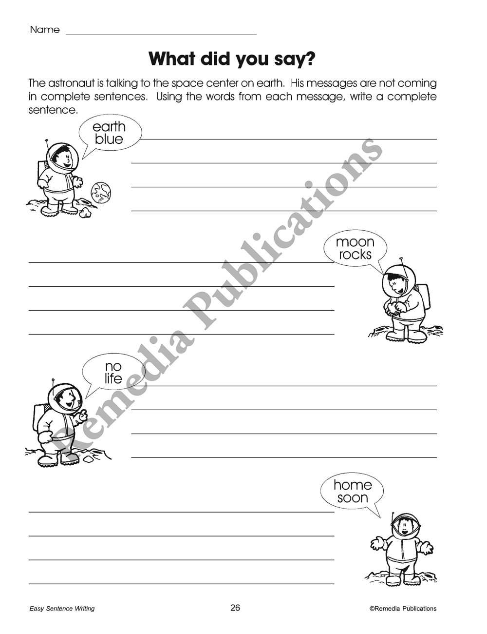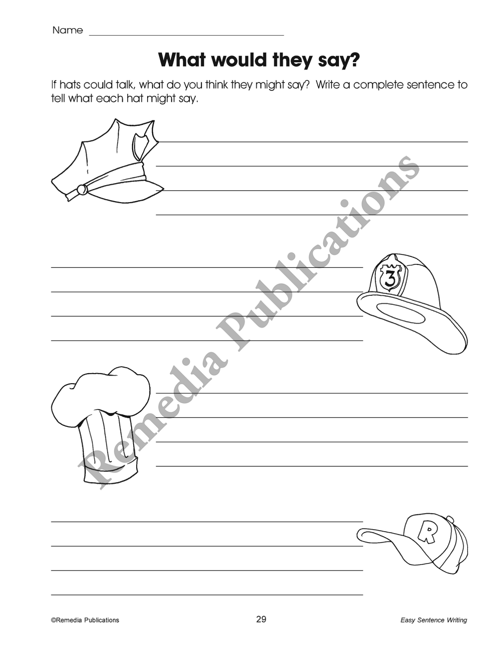 Four writing prompt formats are featured in the 29 activities. Students will write original sentences using word banks, create sentences from pictures, analyze illustrated situations, and write imaginative conversation.